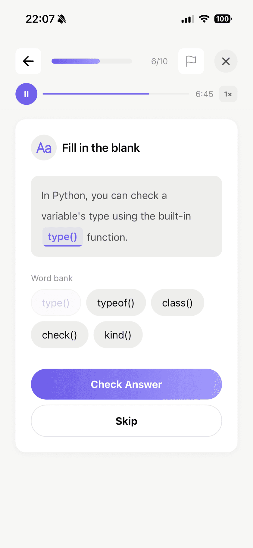 Flashcards, multiple choice, fill-in-the-blank — spaced repetition drills that adapt to what you know and what you don’t.